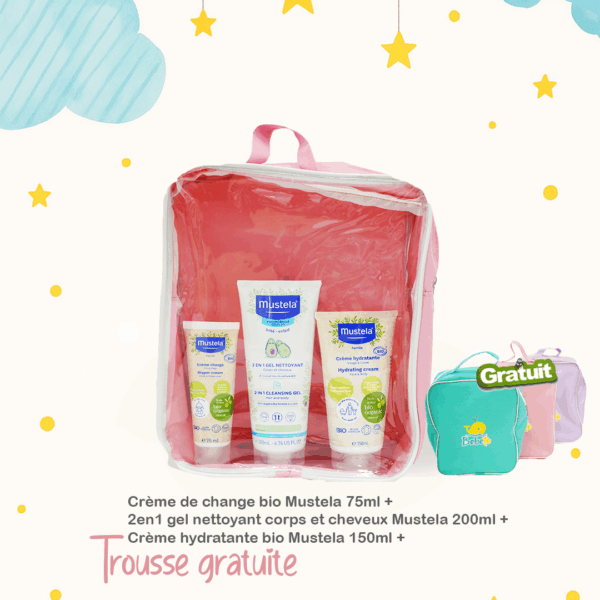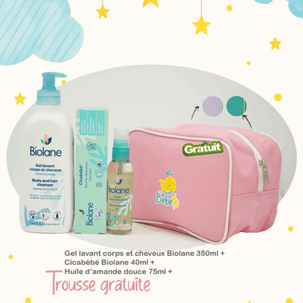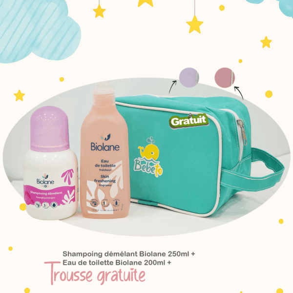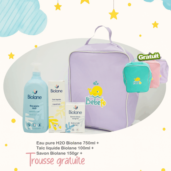 Trousse offerte : Pour chaque pack acheté, recevez une trousse de toilette pratique et élégante, idéale pour transporter les essentiels de bébé lors des sorties ou voyages.