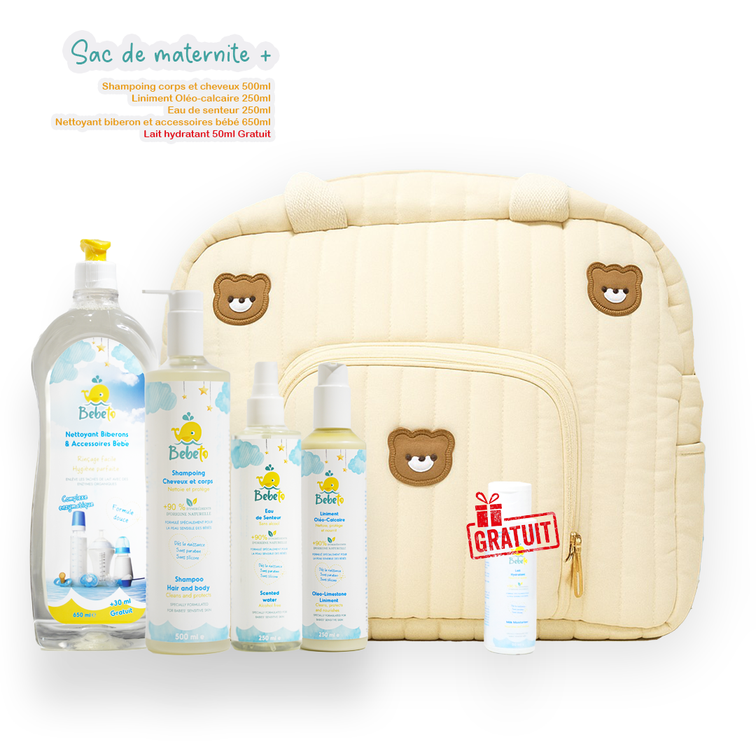 Le Pack Maternité Premium contient un sac à dos et cinq produits de soin et d’hygiène essentiels pour bébé : un shampoing corps et cheveux (500ml), un liniment oléo-calcaire (250ml), une eau de senteur (250ml), un nettoyant biberon (650ml) et un lait hydratant format voyage (50ml) offert.