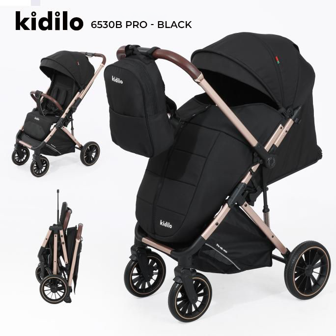 Poussette Kidilo 6530B PRO : légère, compacte et confortable, avec guidon réversible, inclinaison réglable et accessoires inclus. Idéale dès la naissance.