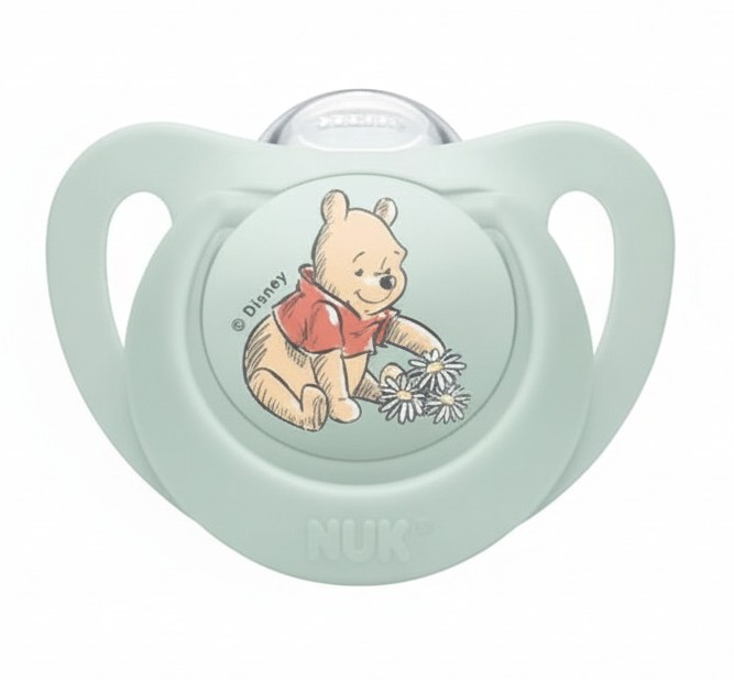 Sucette NUK Star Disney Winnie 0-6 M en silicone doux sans BPA. Confort, sécurité et design adorable pour votre bébé.